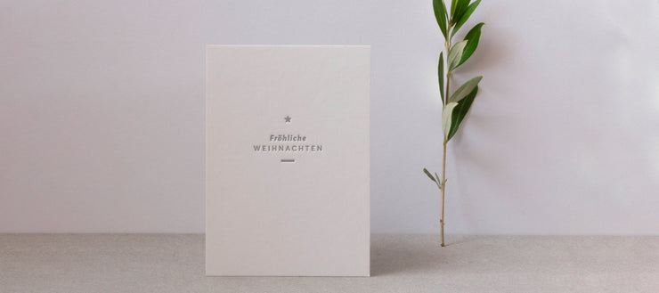 Wir wünschen uns und allen ganz besonders fröhliche Weihnachten, denn ernst ist das Leben oft genug. Umgeben von einem dezenten Stern und einem stabilen Fundament bilden unsere Grüße einen fantasievollen Tannenbaum. So klar und deutlich die Botschaft dieser Karte auch ist, das Motiv lässt viel Raum für ein persönliches Gefühl. Denn jeder erlebt die Weihnachtszeit mit eigenen Vorstellungen und Wünschen.